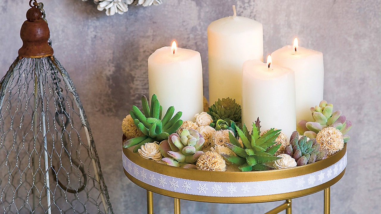 Hozzávalók • óaranyszínű, peremes fémtálca, Ø 21 cm • durva szemű tengeri só, 1 kg • dekorációs kövirózsák, 7-8 db • natúr színű termések, többféle • 4 db fehér tömbgyertya, 8–12 cm magas, Ø 4,5 cm • 1,5 cm széles, fehér hópelyhes szalag, 70 cm • cellux