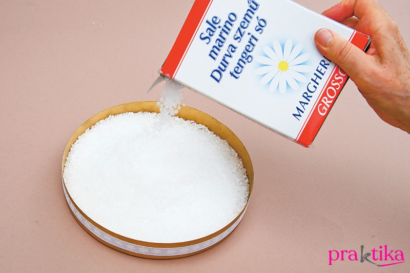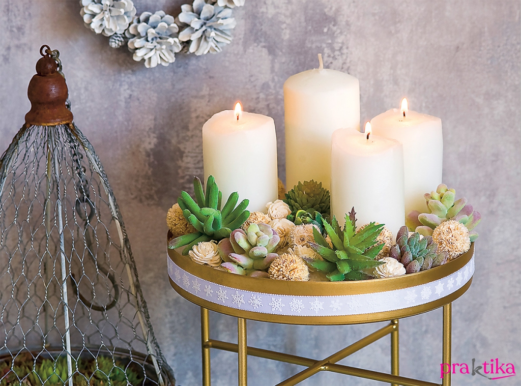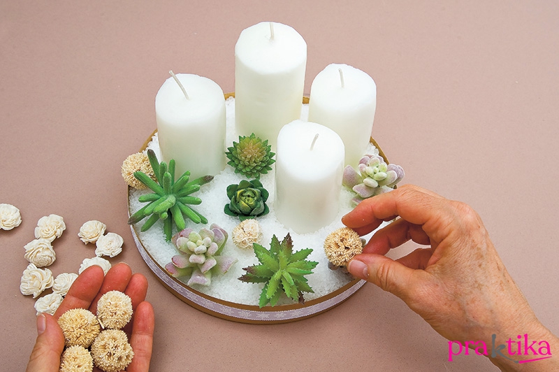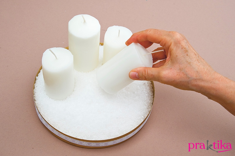 A tálca hátsó részén és a közepén rendezd el, majd nyomd a sóba a négy gyertyát – a legmagasabb hátra kerüljön, a kisebbek előre.