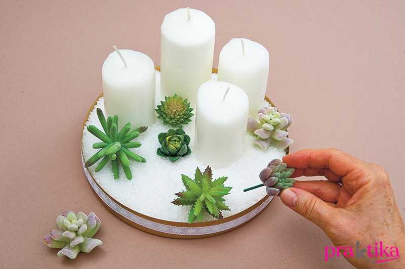 A kövirózsákat tetszés szerint igazítsd a gyertyák köré, és a többi szabadon maradt részre. Nyomd a sóba ezeket is.