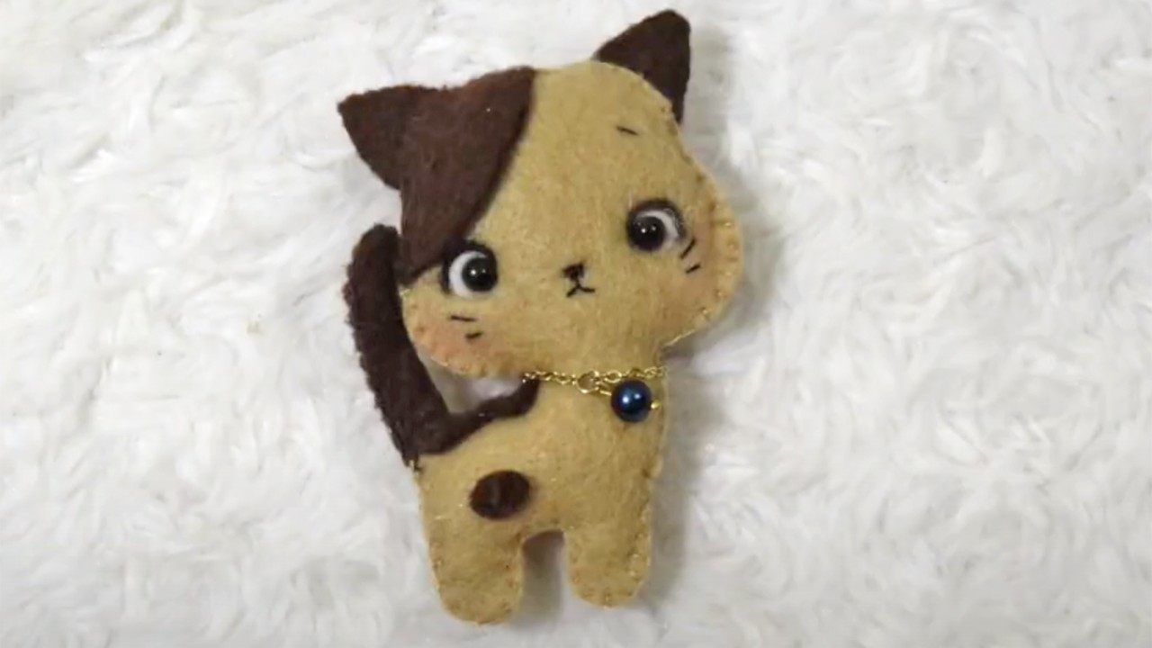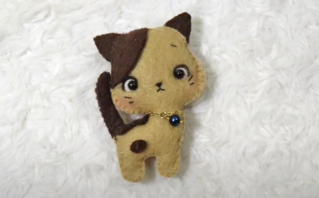 Kattints ide és töltsd le a cica sablonját. Nyomtasd ki és a filcből ez alapján vágj ki mindegyik darabból annyit, amennyi a sablonra van írva: a testét világosbarnából, a többi részt pedig sötétbarnából. Bár a videón a foltokat ragasztóval illeszti a testhez, bátran használhatsz helyette tűt és cérnát. Ha rögzítetted a szemeket, az arc többi elemét pedig meghímezted sötétbarna vagy fekete cérnával, varrd össze a farkincát. Illeszd a test két része közé és kezdd el körbevarrni szegőöltéssel úgy, hogy ne hagyd ki a fülecskéket sem. Miközben varrsz, tölts a testbe egy kevés tömőanyagot. Végül a szemét tűnemezeléssel szépítheted és aprócska láncot is tehetsz a nyakába.