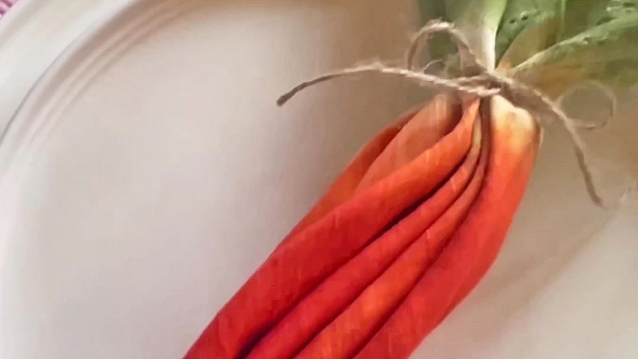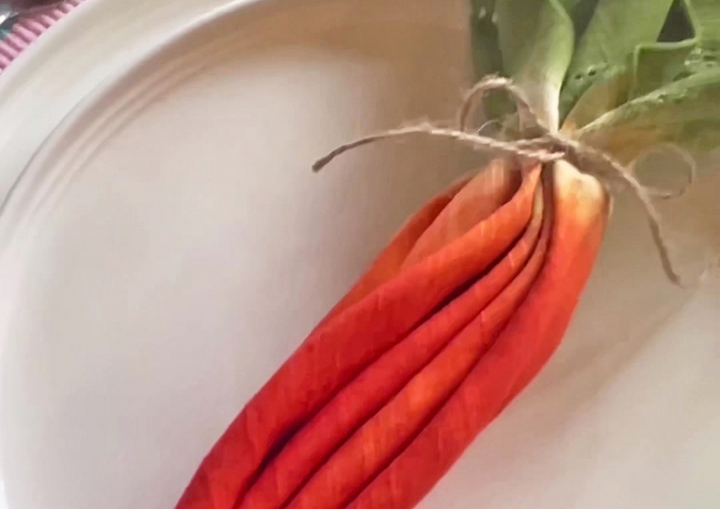 A textilszalvéták két szemközti sarkát egy befőttes gumival gumizd össze. Áztasd vízbe őket. A narancssárga és a zöld textilfestéket töltsd ki egy kisebb befőttes üvegbe. A szalvéták összekötött sarkait mártsd a zöldbe, a többi részüket a narancssárgába. Hagyd őket megszáradni, húzd le róluk a gumit és mintha répák lennének, köss a fehéren maradt részre egy kisebb darab madzagot, hogy ne csússzanak szét.