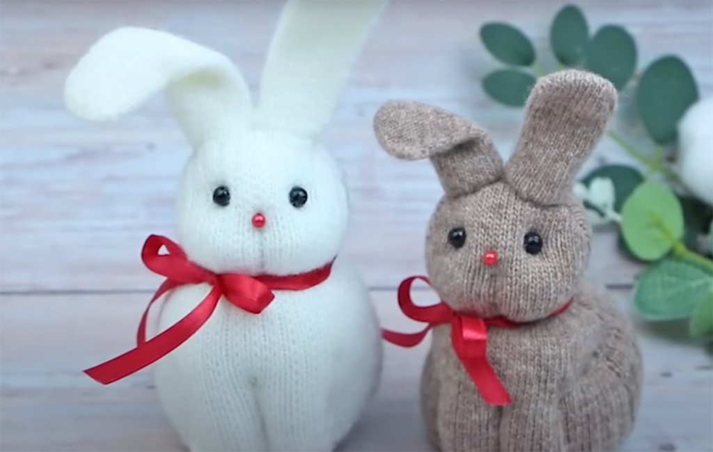 A kesztyűt fordítsd ki, és rajzold rá a nyuszi formáját úgy, hogy a két füle a gyűrűs és a középső ujj legyen. A vonal mentén varrd el és vágd le a felesleges részt. Fordítsd vissza a nyuszit és tömd ki tömőanyaggal. A nyakánál varrd körbe és kissé húzd össze a cérnát. Varrd el a nyuszi testének alját és alakítsd ki a lábakat a videón látható módon. Varrd fel a szemeket és az orrot, és a kesztyű egy megmaradt darabjából készítsd el a farkincáját. Végül köss egy szalagot a nyakába.