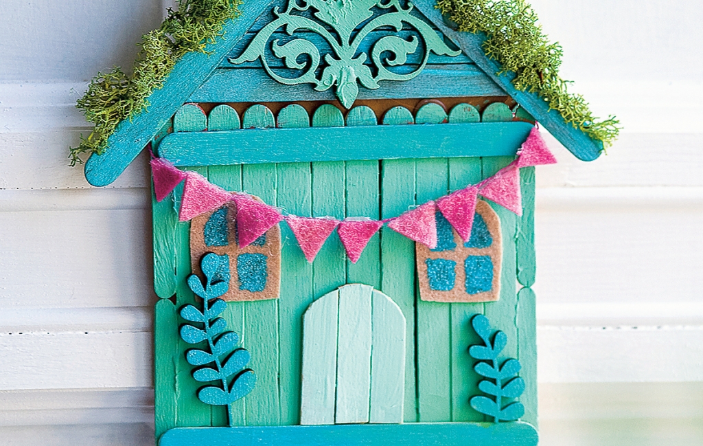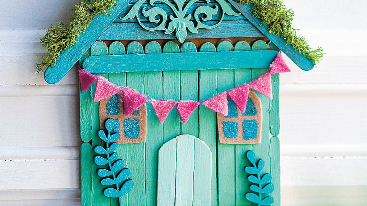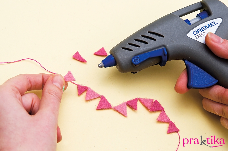 A rózsaszín filcből vágj ki 9-10 darab 1,5 cm oldalhosszúságú pici háromszöget, majd ragaszd fel őket egy darab hímzőfonalra. Akaszd a házikó elejére, a fonalvégeket pedig a hátoldalon rögzítsd melegragasztóval. Szintén a hátoldalra ragassz egy félbehajtott fonaldarabból akasztót.