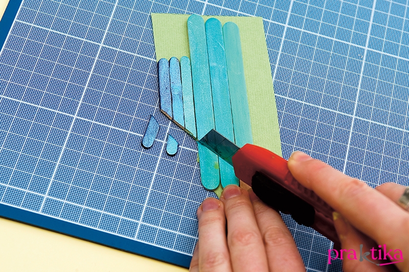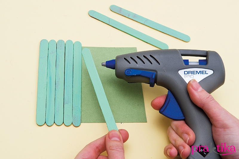 Az alap elkészítéséhez a 11 mentaszínű spatulát melegragasztóval ragaszd szorosan egymás mellé egy darab kartonra. Két türkizt ragassz fel keresztben, a felső és az alsó széltől is kb. 1 cm-re. Ha nagyobb méretű kartonra dolgoztál, a felesleget sniccerrel vágd le.