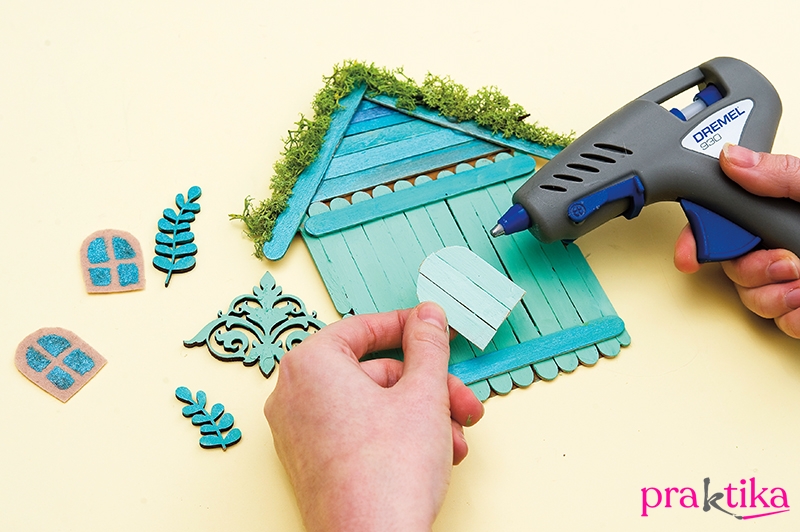 Ragaszd a házikó alapját egy kartonpapírra, majd illeszd a helyére a tetőt is. Hátulról sniccerrel körbevághatod, hogy sehol ne lógjon ki a karton. Melegragasztóval erősítsd fel a dekorációt: középre, az alsó keresztlécre az ajtót, az ablakokat két oldalra, a fa dekorációs elemeket pedig a képen látható helyekre. A tetőre ragassz kevés zuzmót.