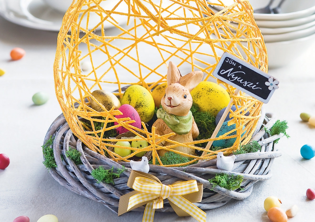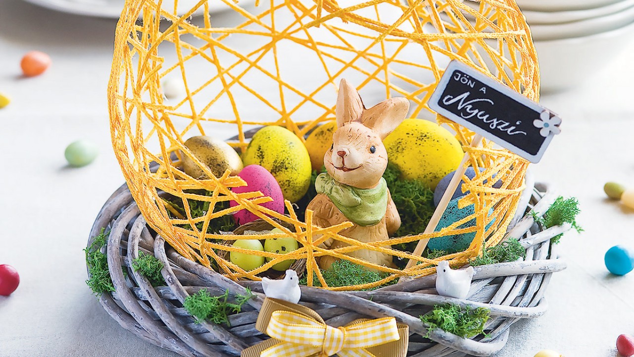 Tegyél a krepp-papírra bőven mohát, majd helyezd el a nyuszit, a színes tojásokat, a minifészket és az üzenőtáblát – erre készíthetsz saját feliratot fehér zselés tollal vagy krétával is. Ha a figurákat nem szeretnéd később cserélgetni, akkor a rögzítésükhöz használhatsz melegragasztót.