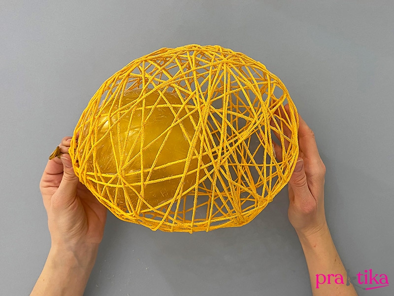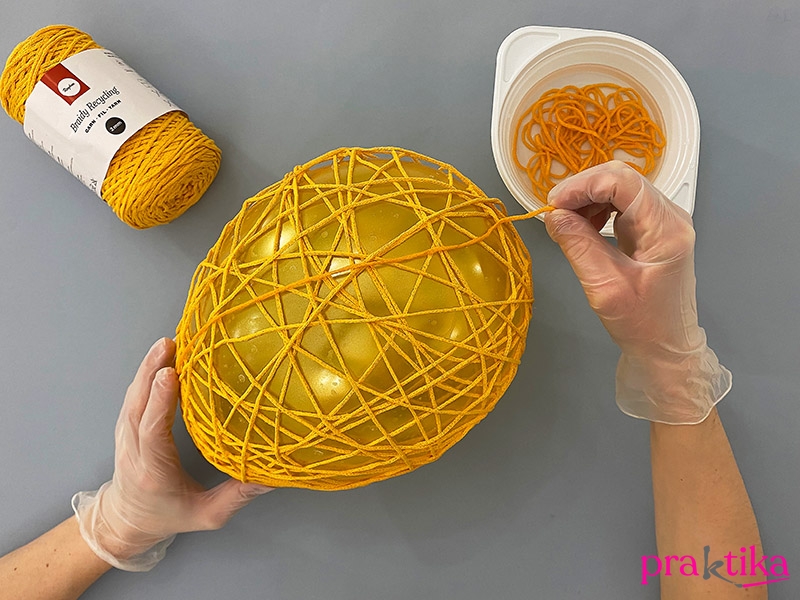 Tekerj le kb. 20-30 méternyi makraméfonalat, és áztasd a folyadékba. Nyomkodd jól bele, hogy a zsinór mindenütt nedves legyen. Tekerd be vele a lufit – dolgozz természetes rendezetlenséggel, így lesz szép az összhatás. Ha elégedett vagy az eredménnyel, tedd félre a lufit száradni: legjobb, ha fel tudod akasztani valahová, de egy tányéron is hagyhatod, ahol néha megforgatod.