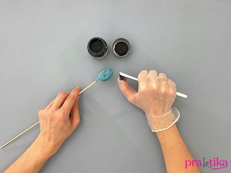 Míg a zsinór szárad, fesd meg a kis műanyag tojásokat: a lyukas végüknél húzd hurkapálcára, majd akrilfestékkel színezd őket kedved szerint. Miután megszáradt az alapszín, húzz ismét kesztyűt, és egy szürke akrilfestékbe mártott fogkefével fröcsköld meg a tojásokat. A művelet előtt borítsd az asztalt műanyag fóliával, vagy tegyél le festőalátétet. A pálcákon lévő tojásokat állítsd bele egy pohárba, és tedd félre száradni a nagy tojáshoz hasonlóan.