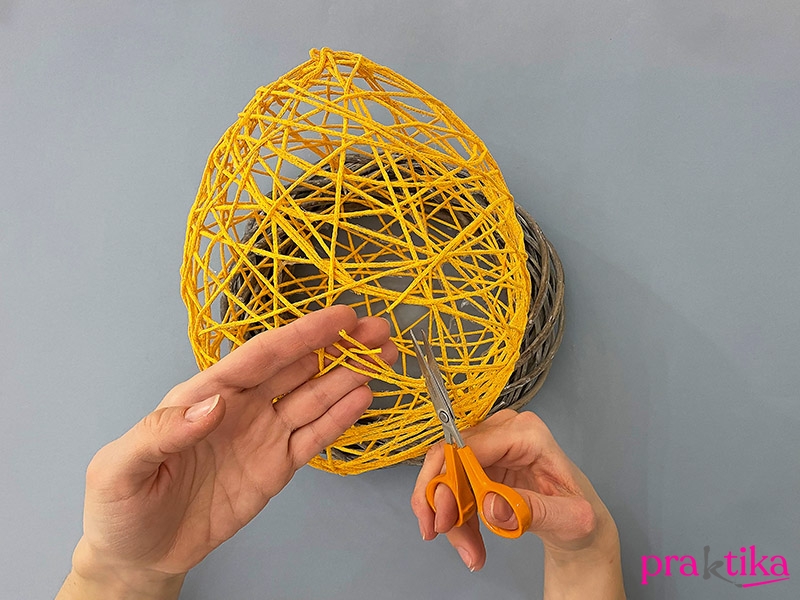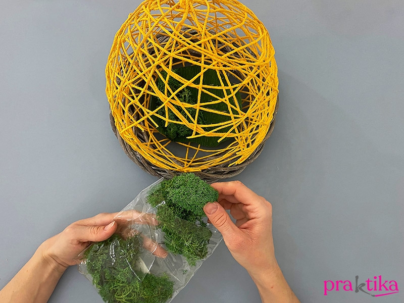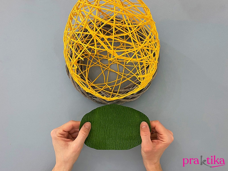 Tedd a zsinórtojást a koszorúalapra, majd az egyik oldalán ollóval vágj akkora lyukat, amin befér a kezed – ebben segít a fotó is. A zöld krepp-papírból vágj ki egy akkora darabot, ami a tojás aljába téve megakadályozza, hogy a moha kiessen. Tedd is bele a tojásba.