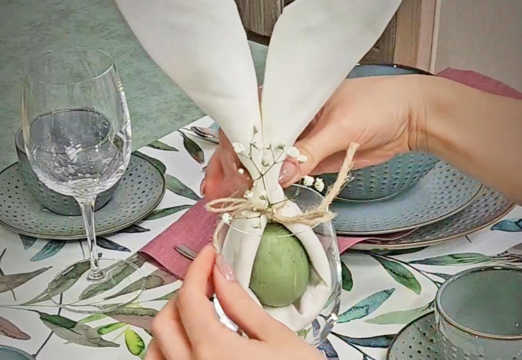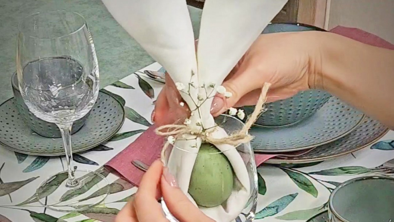 A szalvétát hajtsd ketté, majd tekerd fel, hogy vékonyabb csíkot kapj. A középső részéből készíts egy kis hurkot, és kösd össze zsinórral. Helyezd a tányérra, tegyél a közepébe egy, a terítő színéhez passzoló hímestojást és díszítsd szárazvirággal. Akár pohárban is jól mutat: csak tedd bele a dekorációt tojásostól a borospohárba.