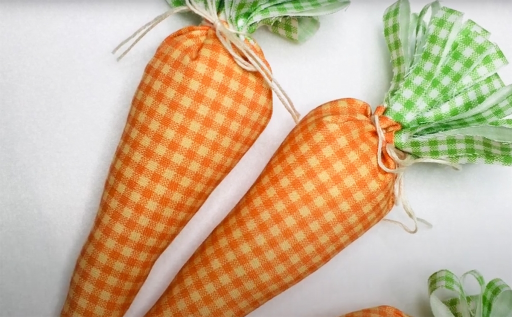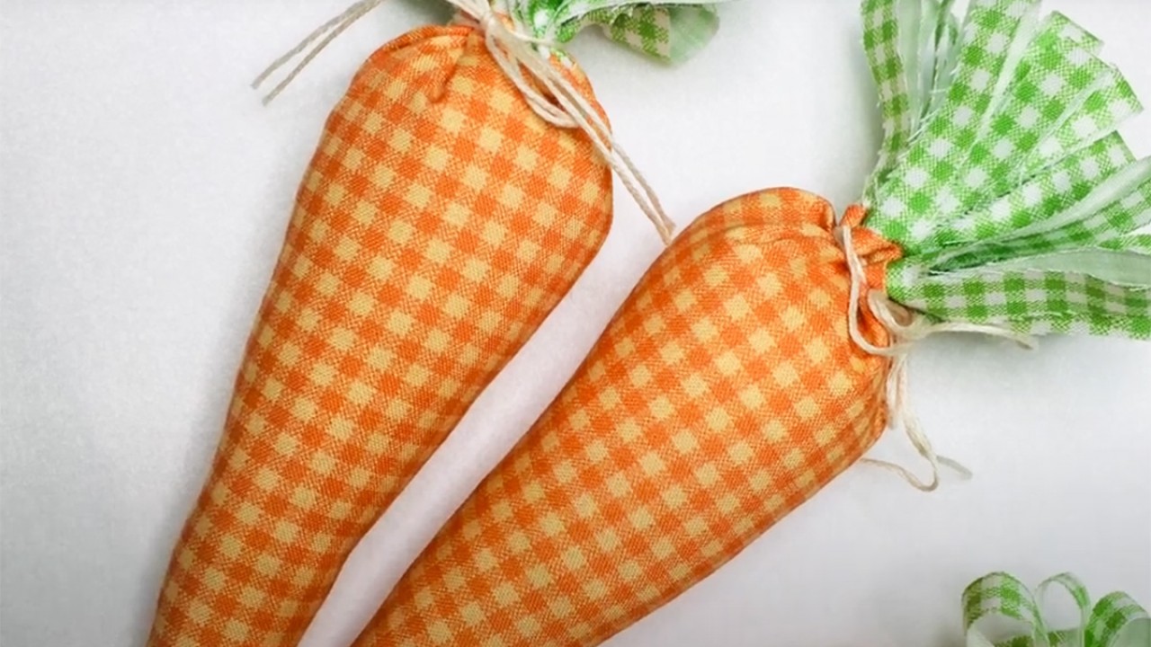 Narancssárga textilből vágj ki egy egyenlő szárú háromszöget, az egyik oldala legyen kicsit rövidebb, a másik kettő hosszabb. A zöld anyagból szabj ki egy téglalapot, a hosszabb oldala legyen akkora, mint a háromszög rövidebb oldala. Hajtsd ketté, illeszd a narancssárga háromszög rövidebb oldalához és varrógéppel varrd össze a videón látható módon. Ezután hajtsd hosszában ketté, és varrd össze a répa szélét is. Fordítsd ki, tömd ki tömőanyaggal, a zöld részt vagdosd be ollóval és a két szín találkozásánál madzaggal húzd össze.