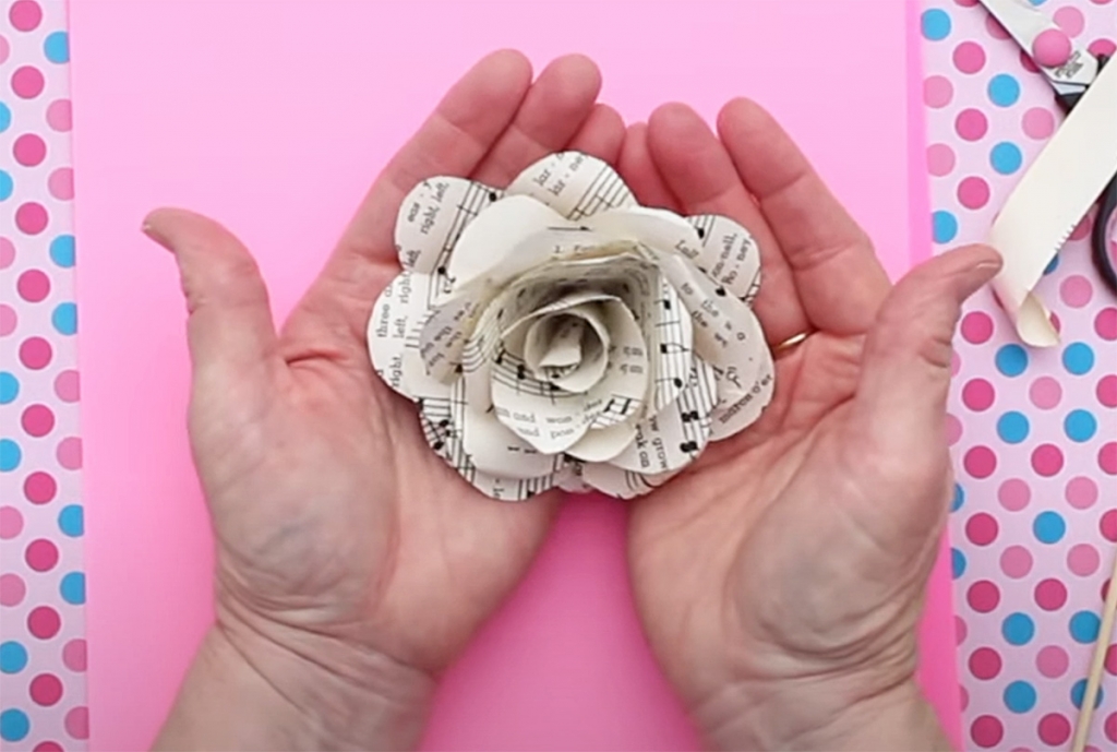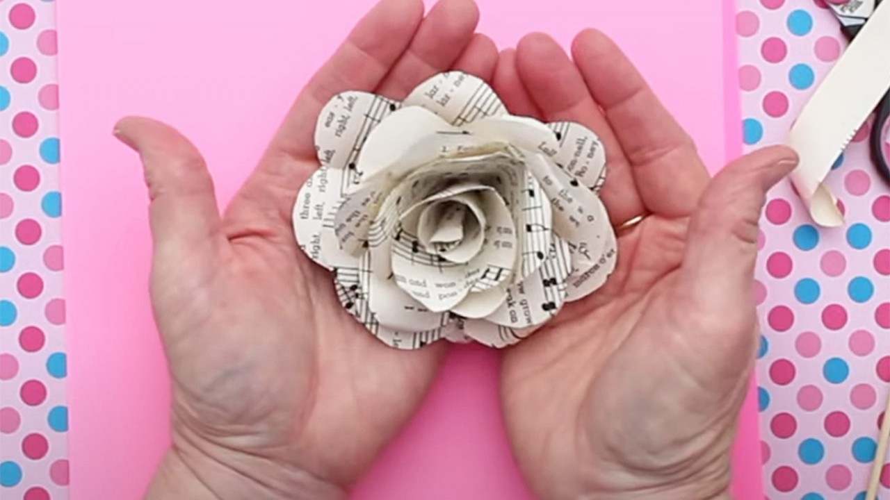 A régi könyv lapjából vagy a kottából vágj ki egy négyzetet. Összesen négy darabra lesz szükséged. A négyzetet hajtsd kis háromszöggé a videón látható módon. Ha megvagy vele, vágd le a csücskét és kerekítsd le a végét. Ha kihajtod, virágformát kell kapnod. A négy virágból vágj ki szirmokat: az elsőből egyet, a másodikból kettőt, a harmadikból hármat, a negyedikből pedig négyet. Az így kapott darabokat ragaszd össze a két szélső szirmuknál, kissé hajtogasd ki a szélüket, majd a virágokat tedd egymásba és rögzítsd ragasztóval. Végül illeszd hozzá a hurkapálcát és tetszés szerint készíts a virághoz egy-két levelet is.