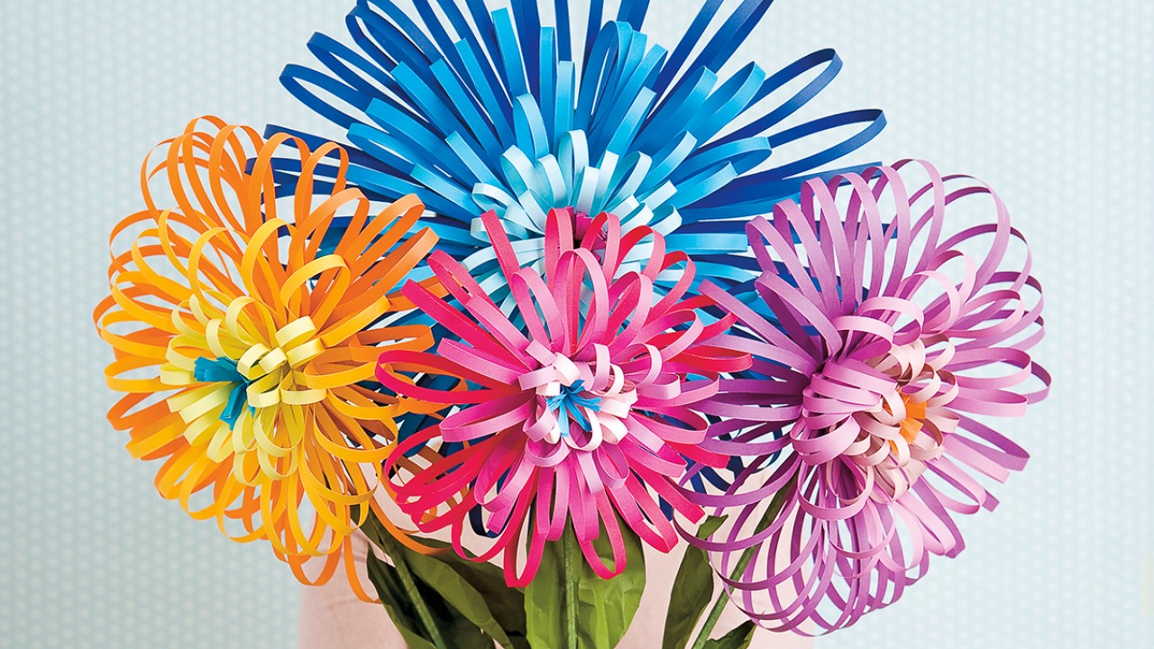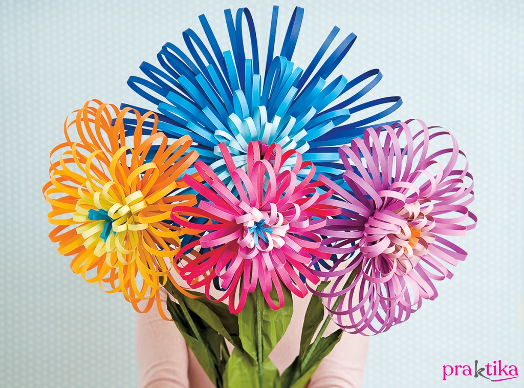 A három legnagyobb papírlapot vágd fel a hosszanti oldaluk mentén 1 cm-es csíkokra. Válogasd szét színek szerint. Az egy plusz A4-es kartonpapírból vágj ki 3 db 6 cm átmérőjű és egy 8 cm átmérőjű korongot (ez utóbbit a végén, a szárragasztásnál fogod használni).