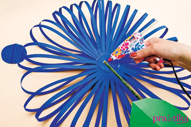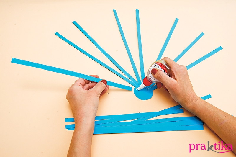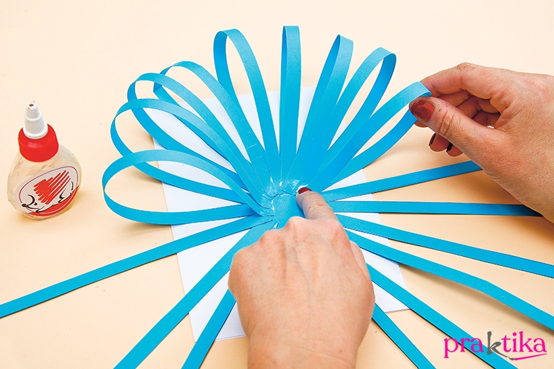 Vegyél magad elé egy korongot, és sugarasan ragaszd körbe az azonos színű csíkokkal. Minden papírcsík másik végére tegyél egy pötty ragasztó, és ragaszd középre. Így készítsd el a három sötétebb kék árnyalatú elemet.
