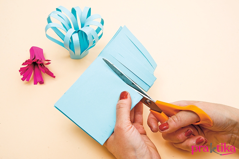 A virágközéphez vagdosd be a ciklámenszínű papírcsíkot a rövid oldallal párhuzamosan – itt se vágd át a papír. A kialakult csíkokat az olló élével pöndörítsd ívesre, majd tekerd fel lazán és ragaszd meg, úgy, hogy a papír kifelé kunkorodjon.