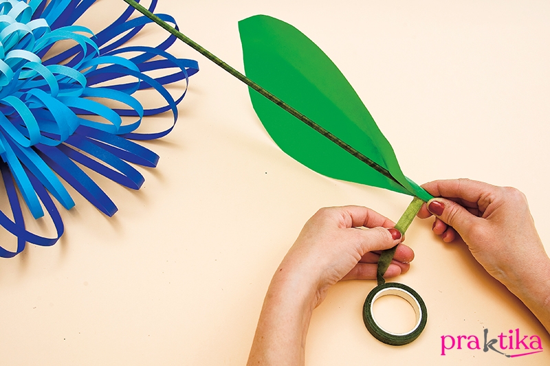 Zöld papírból vágj ki két kb. 25-30 cm hosszú, egyszerű levélformát egy kicsi nyéllel – picit gyűrd meg a papírt, hogy természetesebb legyen az összhatás. Kb. a szár feléhez fogd oda a levelet a kis nyélnél fogva és tekerd át ismét a szalaggal, majd lefelé haladva fogj oda egy újabb levelet ugyanígy.