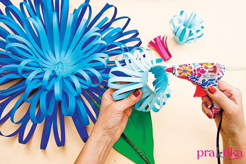 Hozzávalók egy nagy virághoz • színes, vékony kartonok, sötétkék, 50×40 cm, középkék, 40×30 cm, világoskék, 30×20 cm, halványkék, 20×18 cm, ciklámenszínű, 7x15 cm, zöld, 20x30 cm • plusz 1 db kék kartonpapír, A4 (a korongoknak) • 4 db hurkapálca • papírragasztó • melegragasztó • vonalzó, ceruza, olló • zöld szártakaró kreppszalag