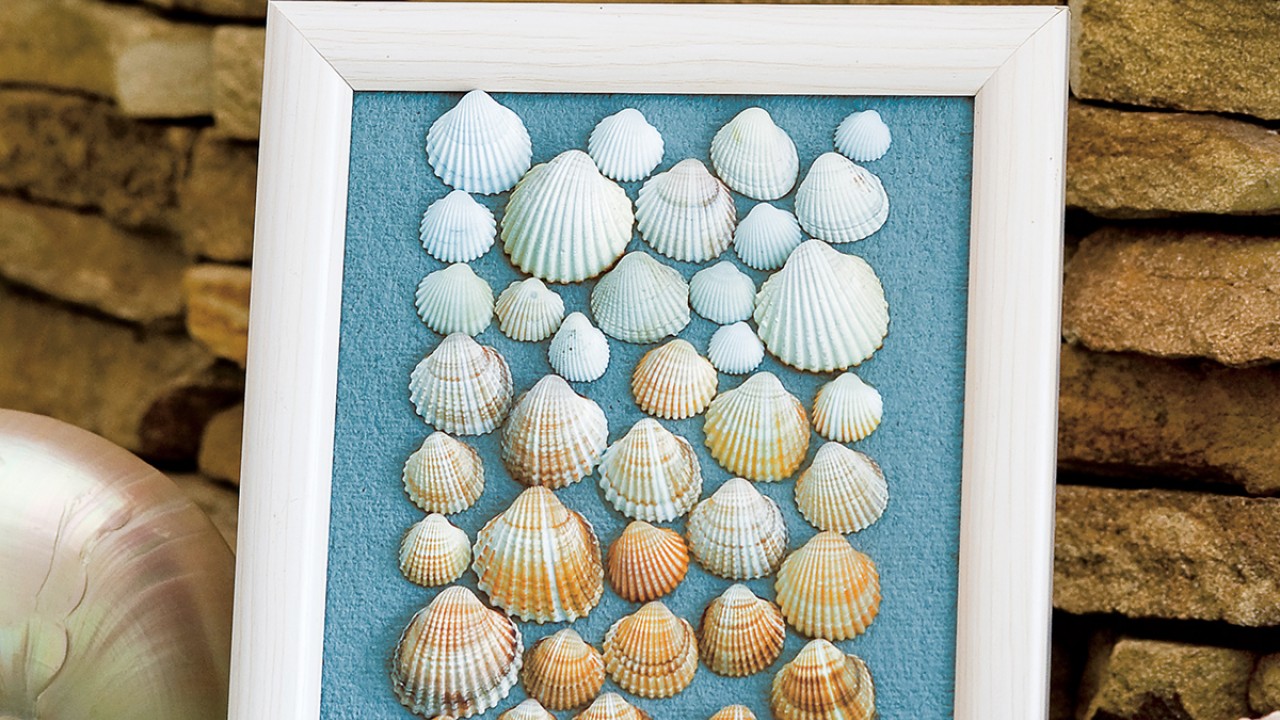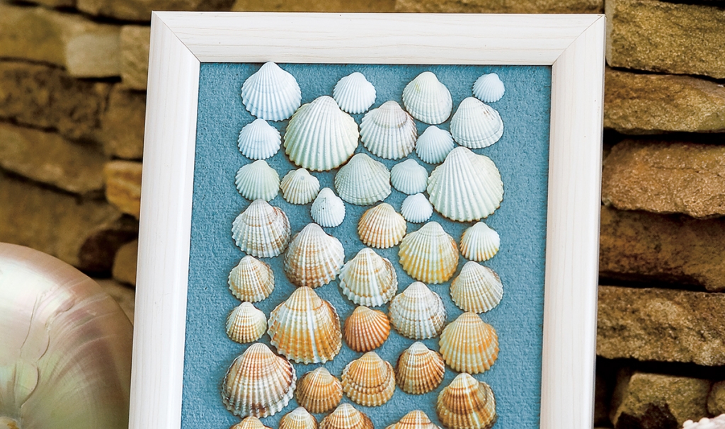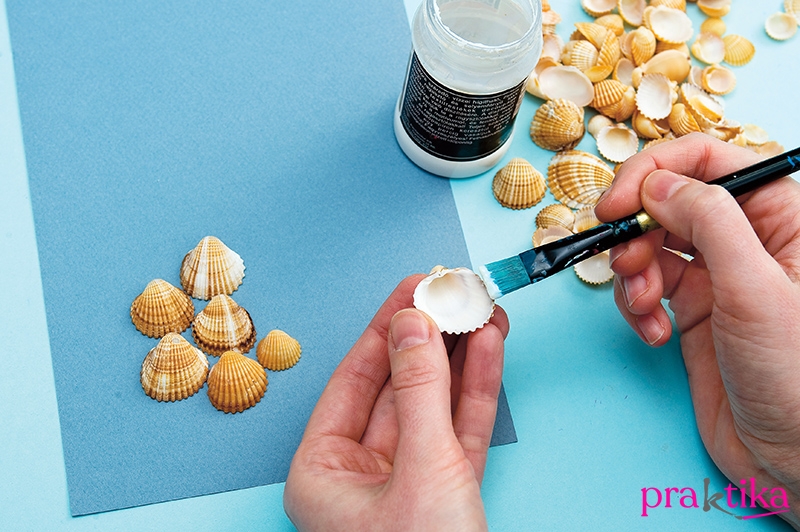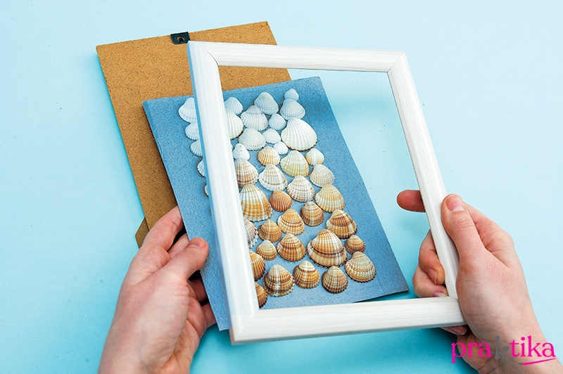 Ecset segítségével kend be folyékony ragasztóval a kagylók peremét, és egyesével ragaszd őket az alapra. Próbáld azonnal a megfelelő pozícióba illeszteni, hogy ne kend össze ragasztóval a kartont. Amikor megszáradt a kép, óvatosan radírozd le az esetlegesen látszó ceruzavonalakat, majd tedd bele a keretbe.