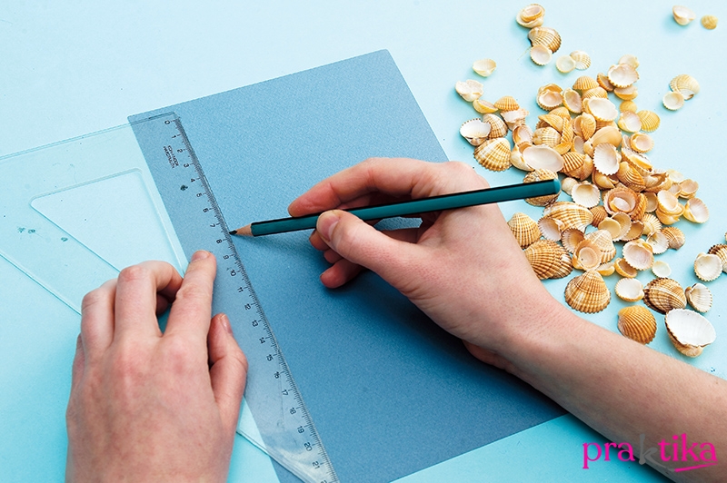 A kartont vágd akkorára, ami pontosan illik a képkeretbe. Vonalzó mellett, ceruzával húzz egy-egy függőleges vonalat a hosszabb oldalaival párhuzamosan, a keret szélétől 2 cm-rel beljebb. Ezek a segédvonalak támpontot adnak majd, hová helyezd a kagylókat.