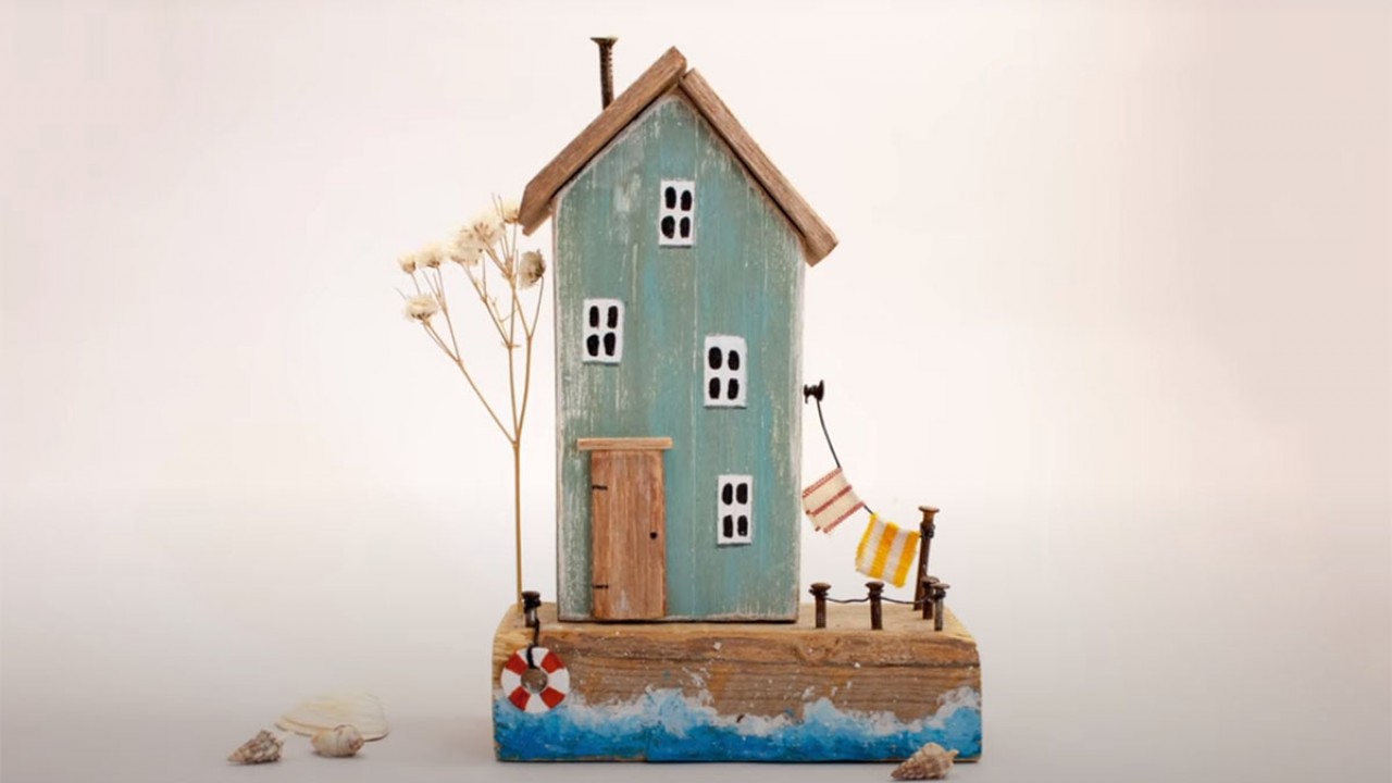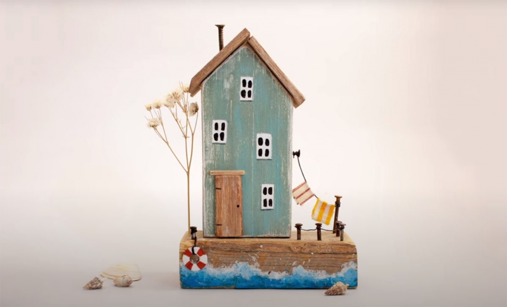 Ha szükséges, a két fadarabot fűrészeld megfelelő méretre és formára. Az egyik lesz az alap, a másik pedig maga a házikó. Fűrészelés után csiszold simára a felületet. Ezután jöhet a festés: a házikót fesd le tetszőleges színűre, az alapra pedig fesd fel a tenger hullámait. A házikó aljához ragassz egy kisebb deszkadarabot, ez lesz az ajtó. Ezután jöhet az ablakok felfestése, és a tető felragasztása. A tetőre szögelj egy szöget, ez lesz a kémény. A házikót rögzítsd az alaphoz, majd jöhet a dekorálás, készíthetsz hozzá például szögekből és drótból kerítést.