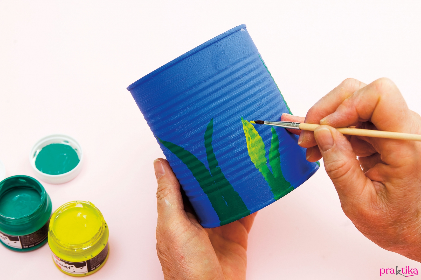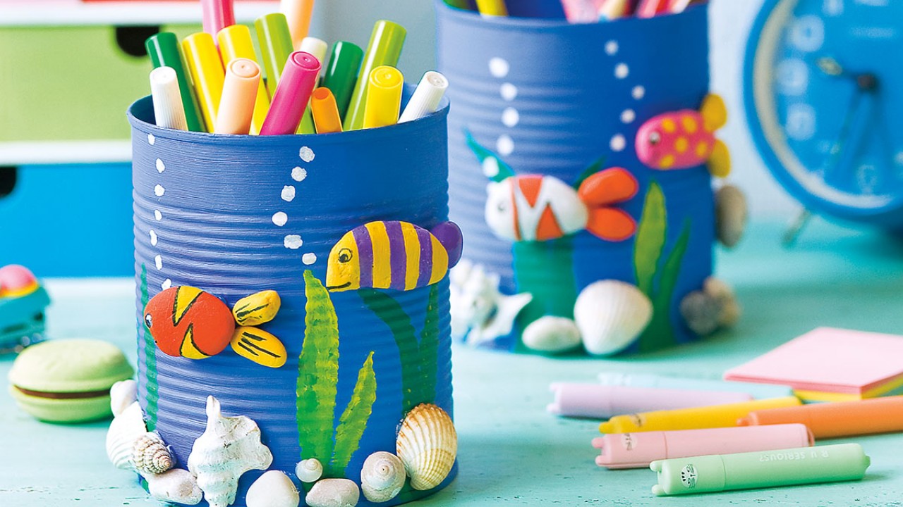 Hozzávalók • 1–2,5 cm-es folyami kavicsok • üres, nagyobb konzervdobozok, pl. 12 cm magas, 10 cm átmérőjű • akrilfesték királykék, többféle zöld, pink, sárga, lila, narancssárga és fehér színben • fekete, vékony hegyű alkoholos filctoll • melegragasztó • indigó (opcionális) • gyurmaragasztó, kisebb spatula • széles és vékony ecset • selyemfényű lakk