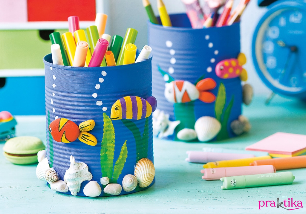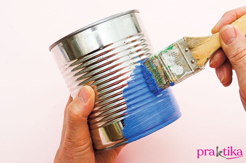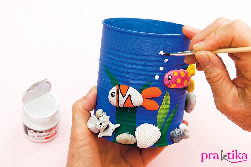 A konzervdobozokat és a kavicsokat, kagylókat, csigákat tisztítsd meg alaposan, ha kell, kefével sikáld le a szennyeződéseket. Szárítsd meg mindegyiket. A királykék akrillal fesd le a konzervdobozokat kívül, és belül a karimájánál is. Ha az egységes színhez szükséges, többször is fesd át, közöttük kivárva a száradási időket.