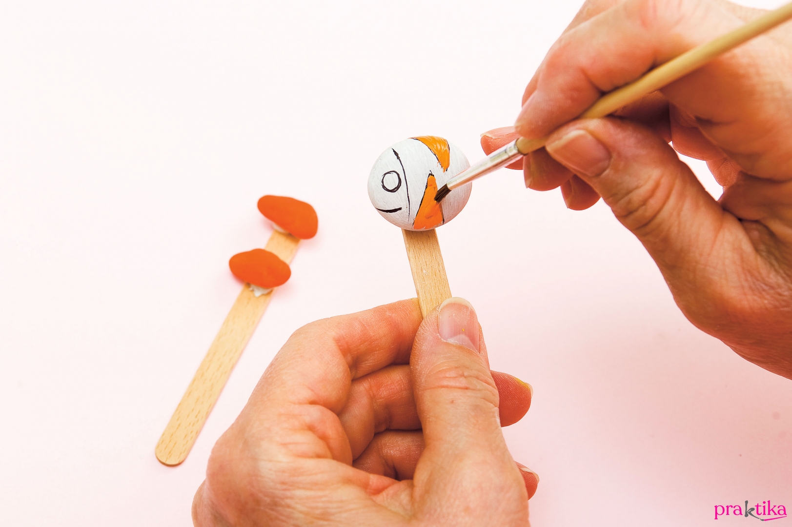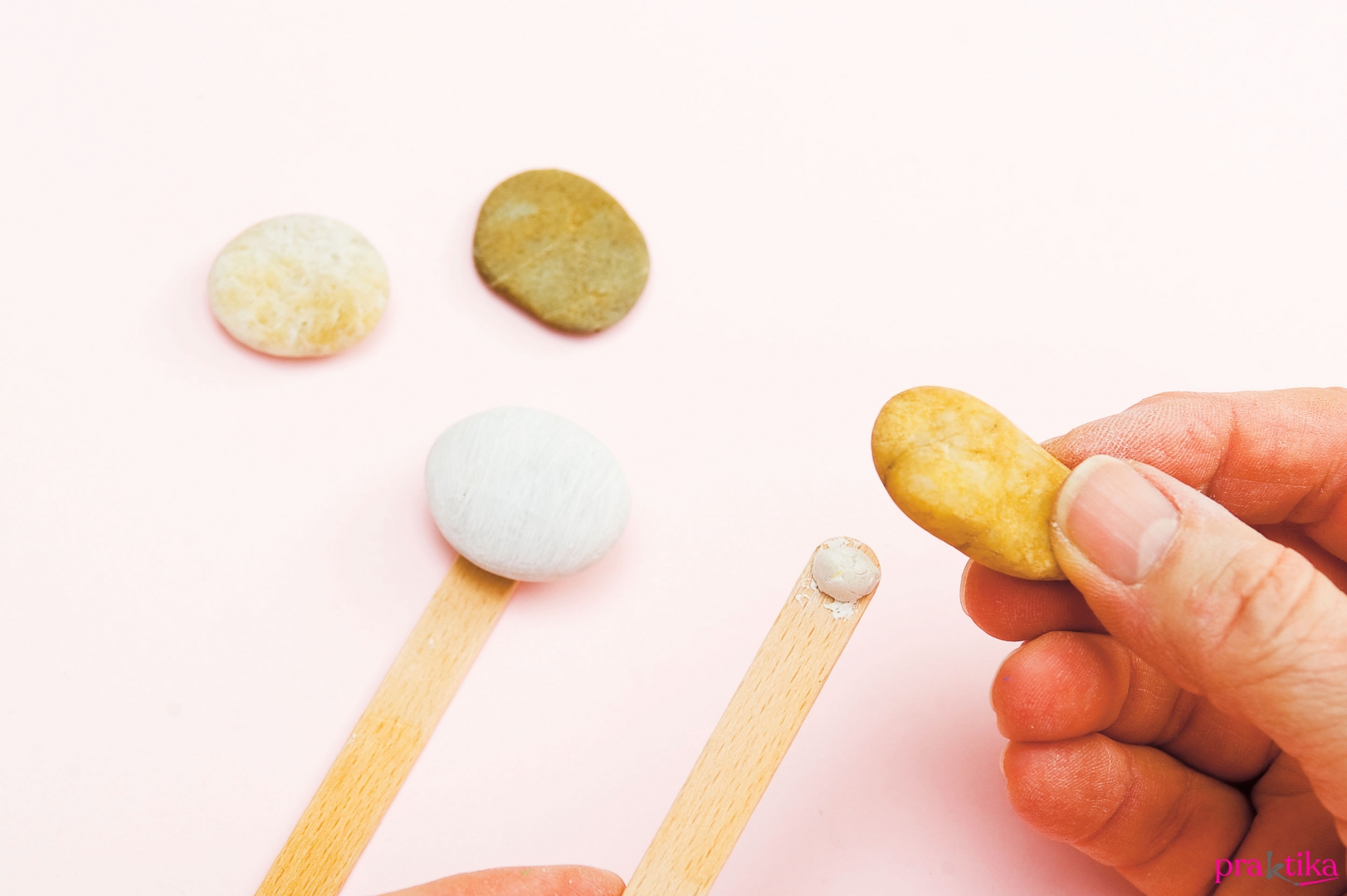 A kavicsokból válaszd ki, melyek leszek a haltestek, melyek a farokúszók. Ezeket egyenként rögzítsd gyurmaragasztóval a spatulák végére – így könnyen tudod tartani a darabokat festés közben. Elsőként alapozd le mindegyiket fehér akrillal, és hagyd megszáradni.