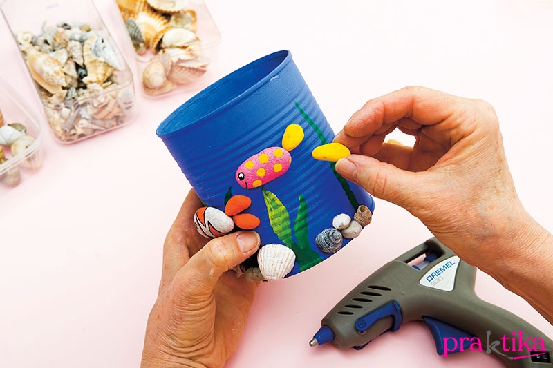 Egy ilyen miniakvárium elkészítése családi program is lehet. A vízparti nyaralások, kirándulások alatt gyűjthettek a gyerekekkel különféle alakú folyami kavicsokat, kagylókat, csigákat. A halacskák testéhez 2-2,5 cm-es, a farokúszókhoz 1-1,5 cm-es kavicsok lesznek jók. A festésükhöz a mintázatokat kinézhetitek képes albumokból, de a saját ötleteiteket is megvalósíthatjátok. A növényeket is festjük, de a halak és a „föveny” rögzítéséhez melegragasztót használunk, amihez a kisebbek kérjék felnőtt segítségét.