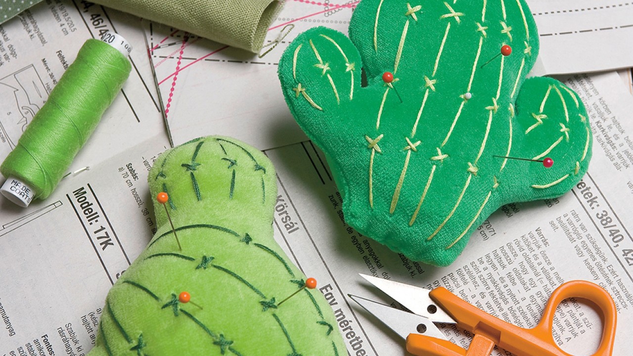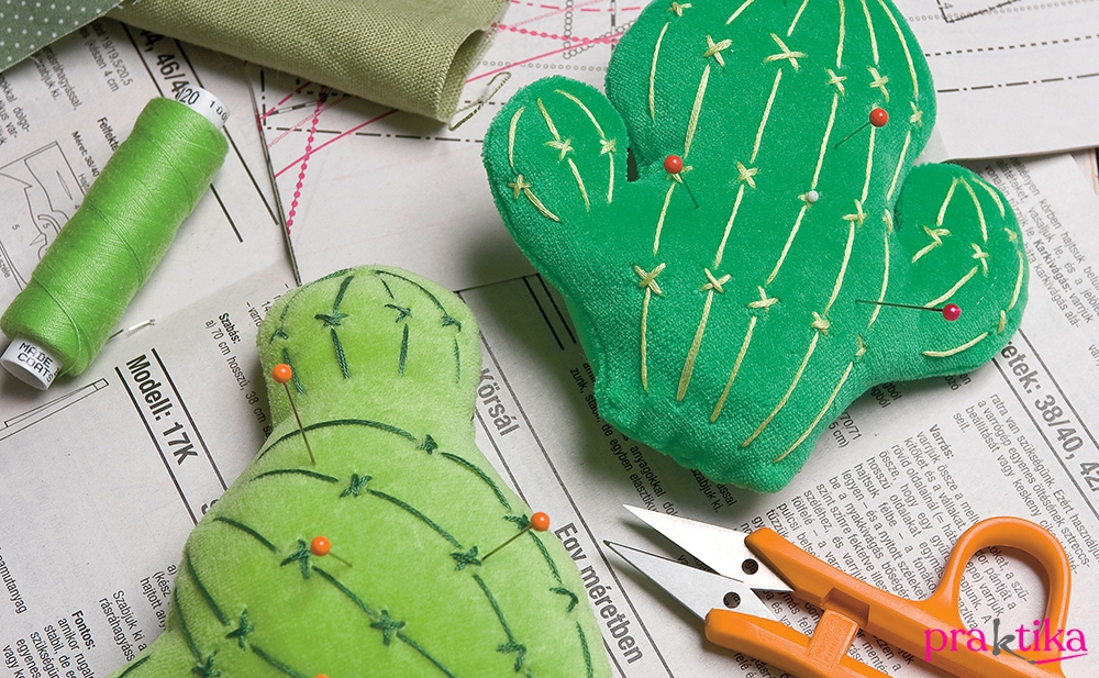 Rajzold rá a kaktuszmintát a színével befelé félbehajtott bébiplüssre, és varrd körbe a kaktusz alja kivételével. Vágd körbe cikcakkollóval, fordítsd színére, majd tömd ki közepesen keményre. Öltsd be kézzel az alját és hímezz hosszanti csíkokat és x-eket a kaktuszra.