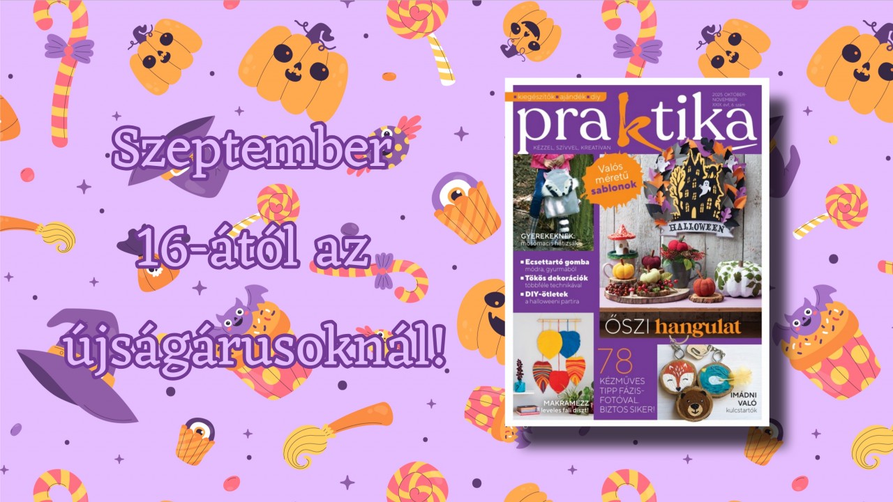 Szeptember 16-án megjelent a Praktika magazin október-novemberi száma, benne 78 kézműves tippel, amelyekhez sok-sok fázisfotót és részletes leírást is mellékeltünk. Alkotóink ezúttal az ősz varázslatos színeiből, motívumaiból és formáiból inspirálódtak, de előkerültek a kedves, vicces, és persze „rémséges” halloweeni ötletek is. A lapot keresd az újságárusoknál vagy rendeld meg a praktikawebshop.hu oldalon!