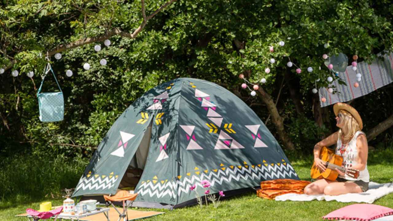 Először vágd ki a bordűr sablonját az öntapadós fóliából, húzd le a védőpapírját, és nyomd a fóliát egy régi törülközőre, hogy a rátapadó szöszök miatt kevésbé ragadjon. Helyezd a sablont a megfelelő szakaszon kisimított, leterített sátorponyvára, és vedd körbe még sok újságpapírral – ez véd a szóródó festékpermettől. Fújd le fehérre, és öt perc száradás után már át is teheted a sablont a következő részre. A nagyobb háromszögek helyét a felállított sátron tervezd meg, majd vedd le a ponyvát, maszkolószalaggal ragaszd körbe a mintákat, és a helyüket fújd le a megfelelő színű spray-vel. A júliusi lapban megmutatjuk, hogyan illesztheted be az összecsukható asztalt a glamping hangulatba, ha ennek is dekorálod a lapját. A kempingezők konyhájának két fő kelléke a gázfőző és a vágódeszka és a polifoam matrac sem maradt átalakítás nélkül.