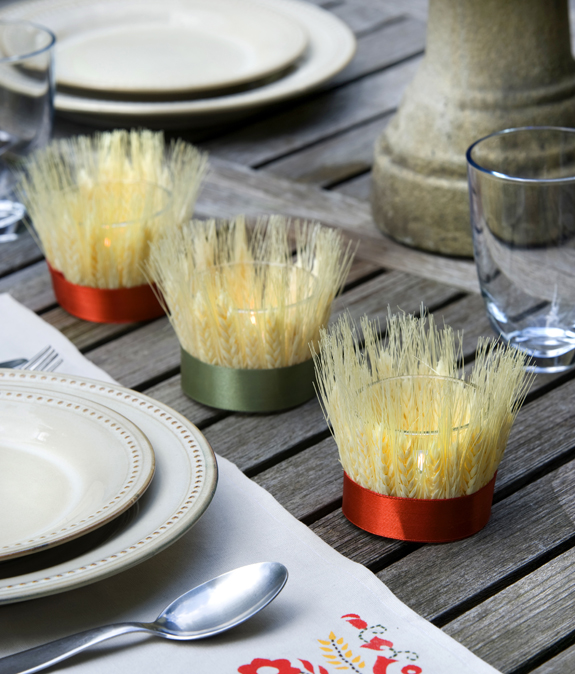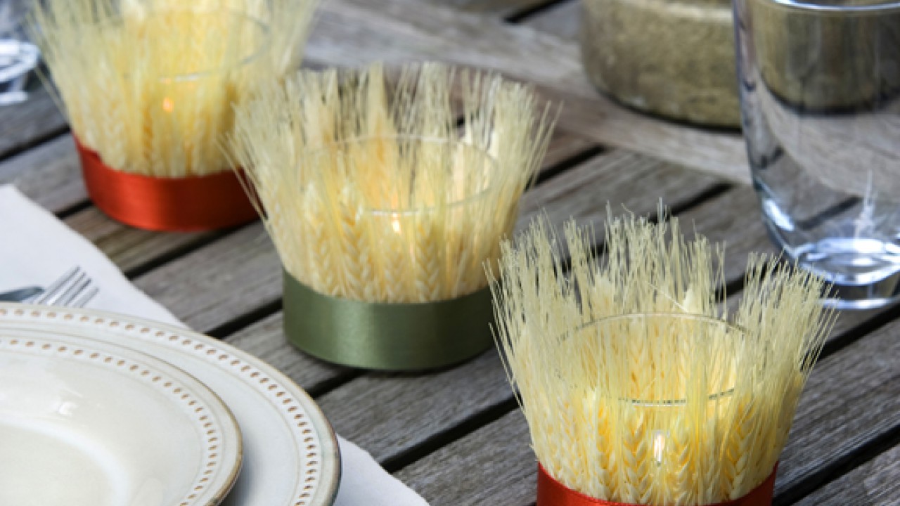 Megidézhetjük az aratás hangulatát néhány kézműves, búzakalászos darabbal, például egy koszorúval, vagy olyan terítéssel, ahol az asztalneműt kalászos mintával díszítjük. Konyhai tárolóüvegeinkre vagy a befőttekre is kerülhet hasonló motívum. Többféle egyszerű technikát is kipróbálhatunk, de egyik sem kíván mesteri gyakorlatot. A koszorúkészítés után megmaradt búzakalászfejekkel egy igazán gyors, úgymond ötperces kiegészítőt készíthetünk. Állítsuk a kalászokat szépen sorban szivacsos kétoldalú ragasztószalaggal kis üvegtégelyek köré. A szárak végét takarjuk el szaténszalagokkal, és kész is a kalászos mécsestartó. Egy natúr színű textil tányéralátét vagy a kenyereskosárba tett kendő is kaphat virágos, kalászos díszítést. Népies stílus illik hozzá, egyszerű, letisztult formákkal.