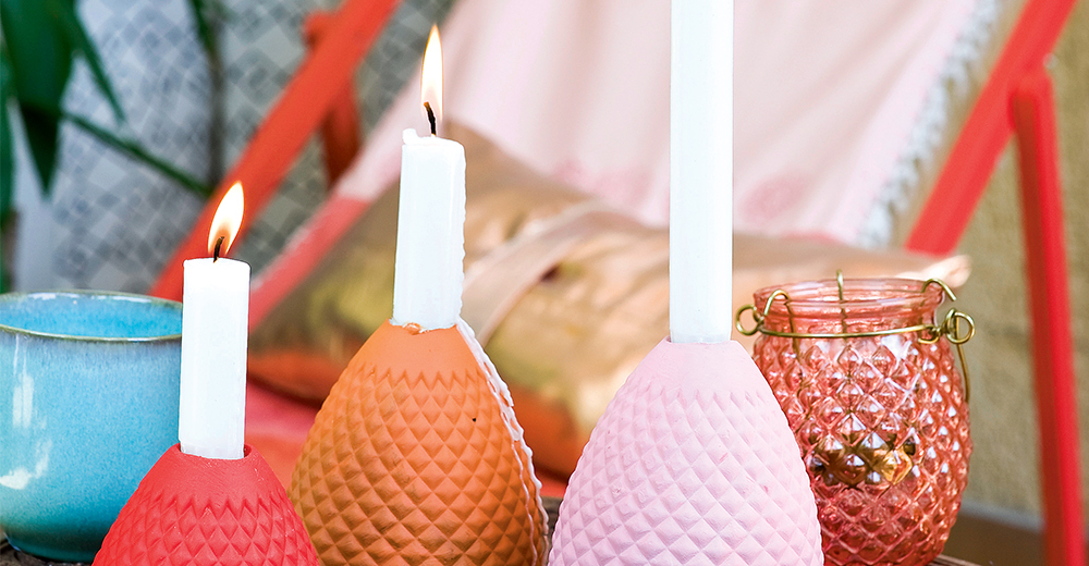 Keress egy struktúrált mintázatú ásványvizesflakont. Vágd le az alsó részét, a szájába nyomj egy gyertyacsonkot kanóccal az üveg szája felé. Állítsd egy pohárba a flakont szájával lefelé. Keverj gipszmasszát és öntsd a formába. Ha megszáradt, hámozd le róla a műanyagot. Égesd el a gyertyacsonkor, így kialakul a mélyedés, ahova az új gyertyát állíthatod. Akrilfestékkel fesd le az elkészült gyertyatartót a kedvenc színeiddel.