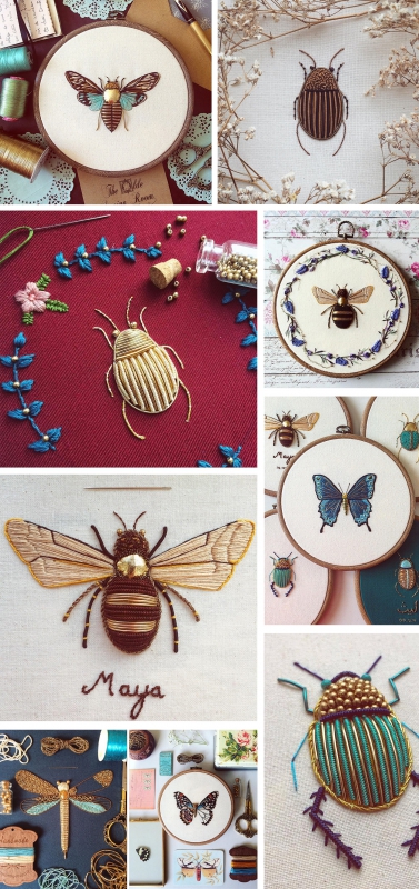 A miniatűr képek antik arany csavart zsinórokból, több száz fémgyöngyből, rokokó szálakból és más finom anyagokból készülnek. Az elkészült bogarak olyan élethűek, hogy akár le is mászhatnának a vászonról. "Gyakran vándorolok az erdőben az otthonom közelében, ahol leveleket, gallyakat, tollakat és egyéb dolgokat gyűjtök" - mondja Altaf. "Szeretem a természet kincseinek a hímzésbe való beillesztését, és úgy érzem minden darabbal egy részem is beágyazódik a munkámba. És ez pont az a részem, amit szeretnék megosztani másokka.l"