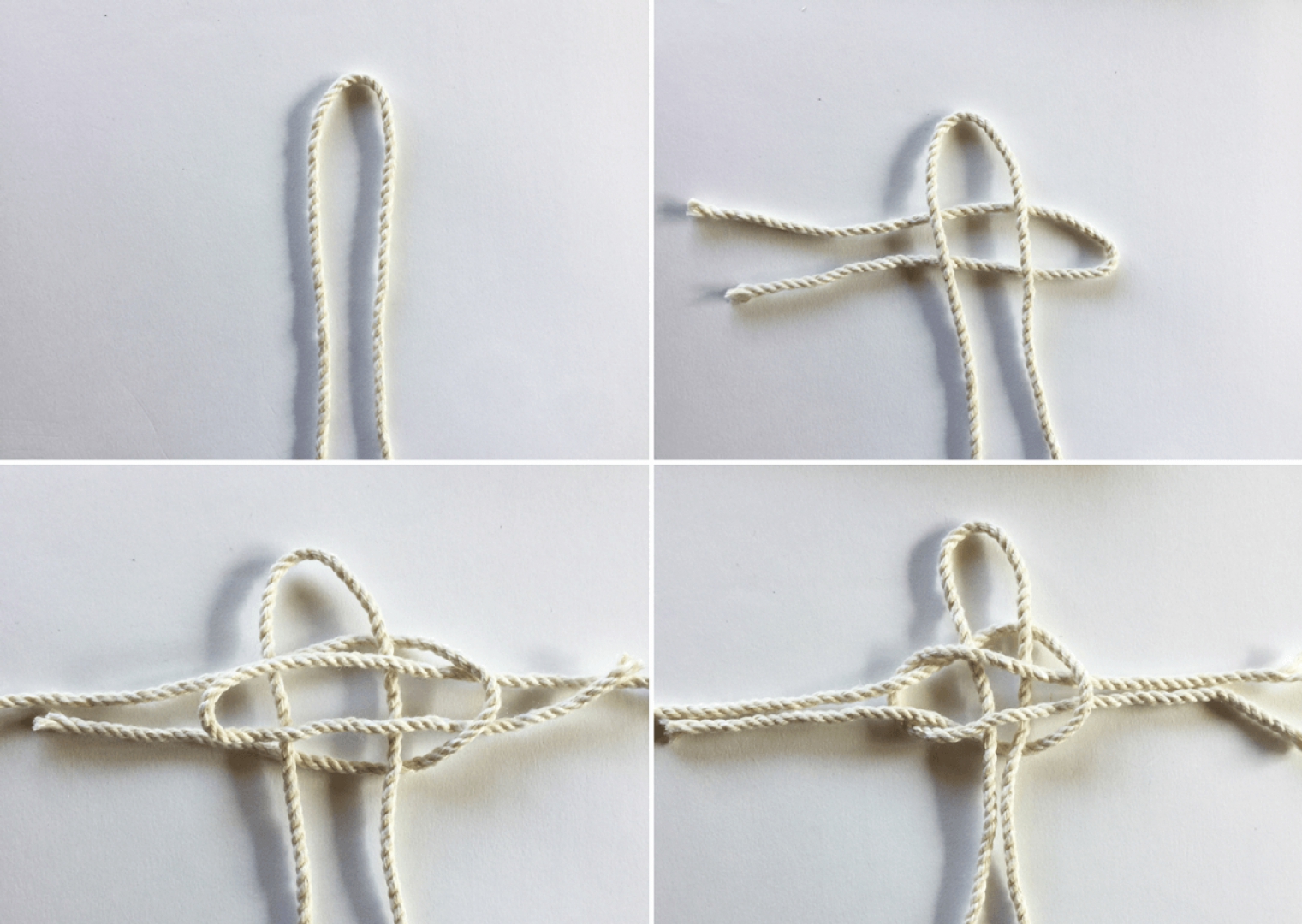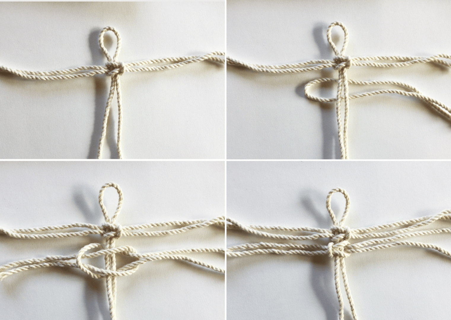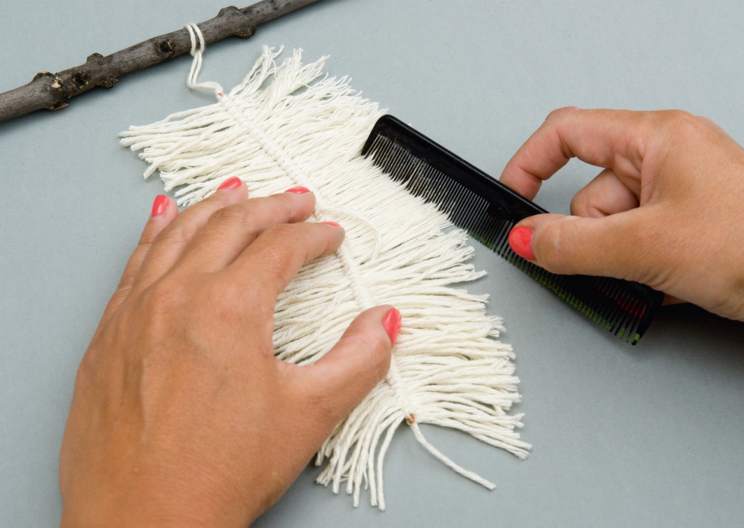 Egy hosszabb fonalat hajts félbe, és hurkold át a faágon. Kicsit lejjebb készíts egy csomót. A drót egyik végét hajtsd vissza, és rögzítsd a fonalhoz egy újabb csomóval. Vágj sok 10 cm hosszú szálat, és kettesével hurkold a drótra és a dupla szálra. Addig végezd ezt, míg egy kb. 15 cm hosszú szakaszon tömör nem lesz. Ekkor hajlítsd vissza a drót végét, és csípd le a felesleget, majd a két fő fonalat csomózva rögzítsd a végét is.