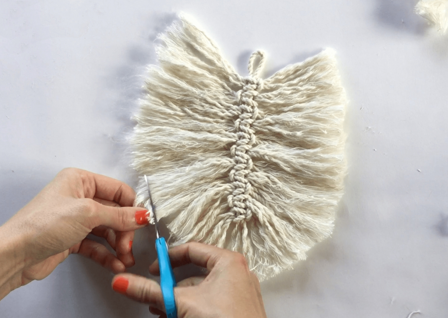 Egy fésű segítségével óvatosan bontsd szét a fonalszálakat a tollas hatásért. Készíts még két másik tollat ugyanezzel a módszerrel, de lehetnek kicsit kisebbek, vagy rövidebbek, illetve a kezdő csomók is lehetnek feljebb.
