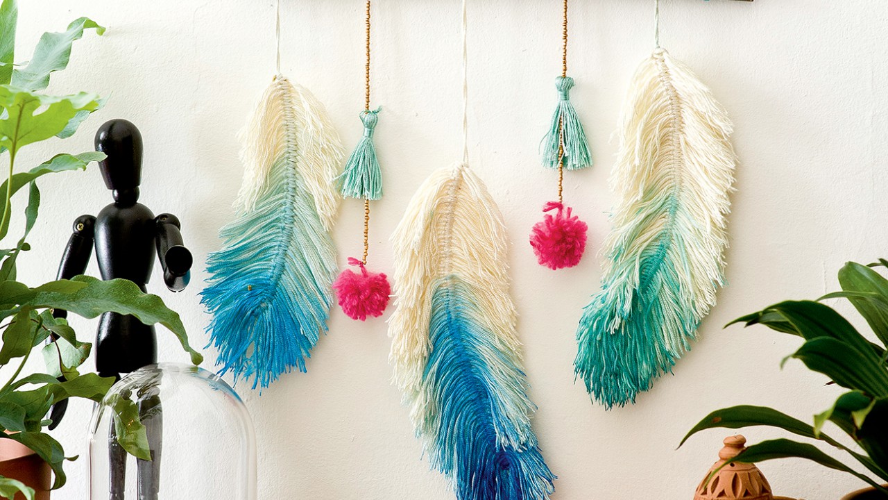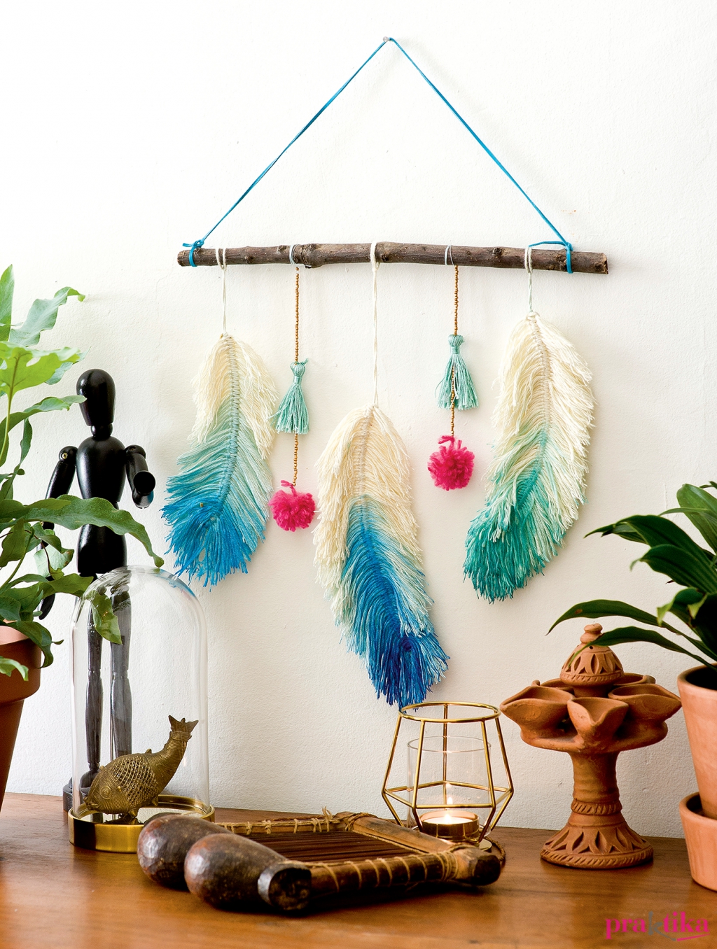 Készíts két apró pompont, kösd őket egy-egy gyöngyfűző szál végre, és fűzz fel gyöngyöket kb. 7 cm hosszan a szálra, majd egy bojtot és újabb 7 cm gyöngyöt. Az utolsó gyöngybe kétszer bújtasd át a cérnát, hogy rögzüljön, és a szálvég segítségével csomózd a faágra két toll közé. Végül köss egy bőrszálat a faágak két végére, és ennek segítségével akaszd a falra az őszi dekorációt.