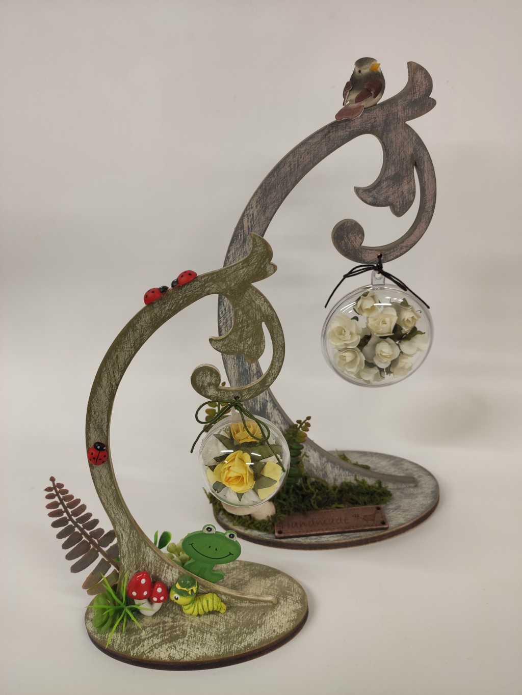 4. Ragaszd fel a kiegészítőket. Mi műnővényeketm gombát (porcelángombát), békát, katicát, mohát, kismadarat ajánlunk.