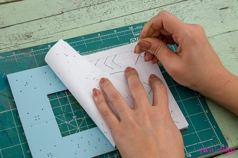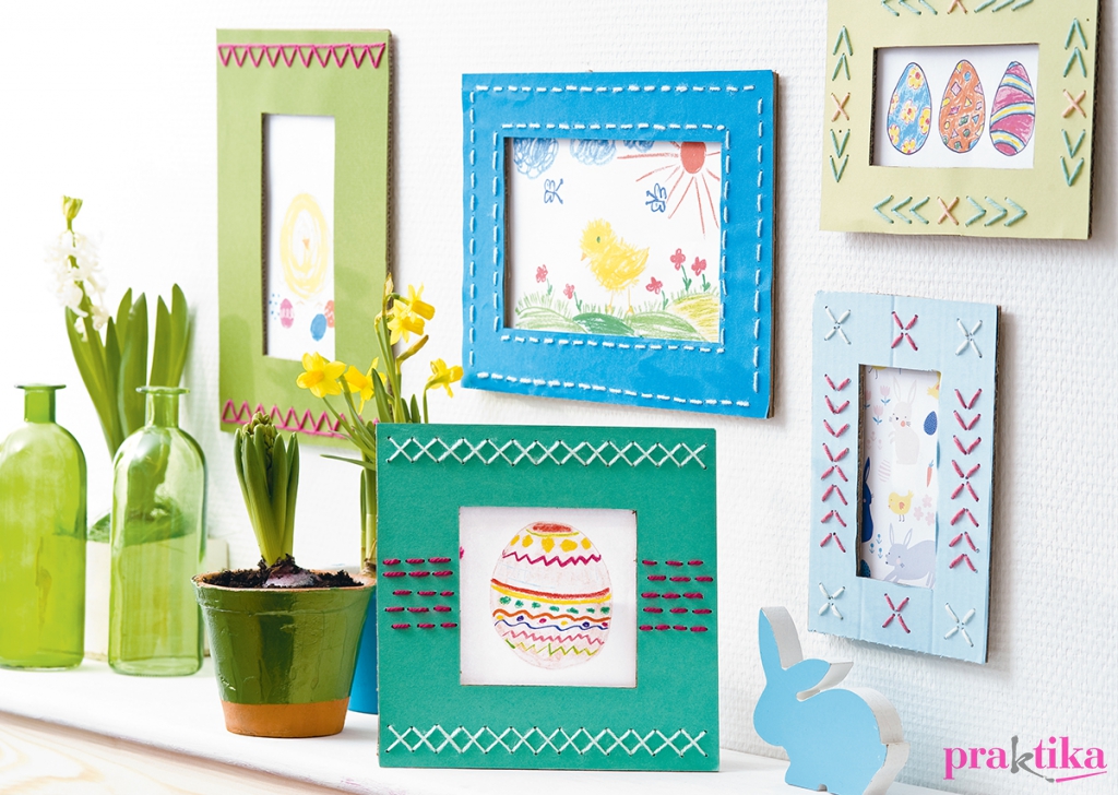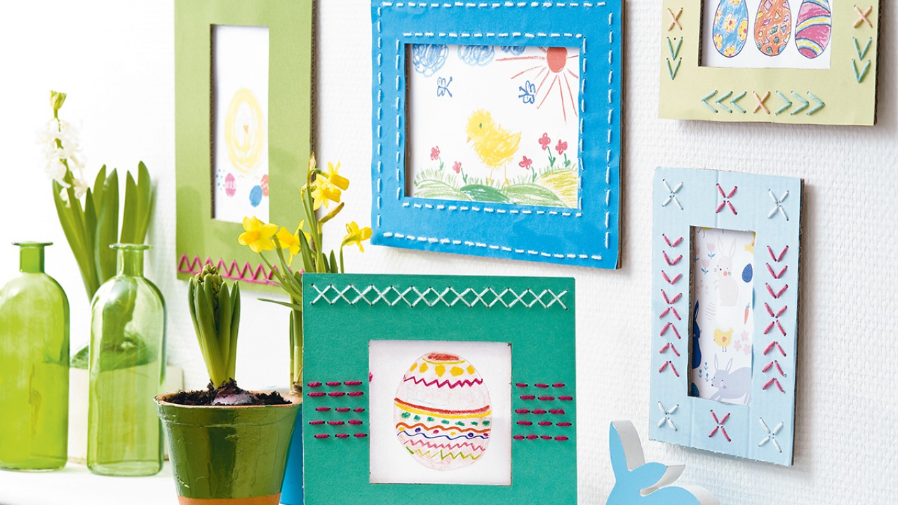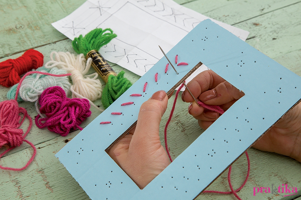 Tű segítségével lyukaszd át a mintát, majd hímezd ki a keretet. A képeket egyszerűen hátulról ragaszd a keretekbe, és gyurmaragasztóval rögzítsd azokat a falra.