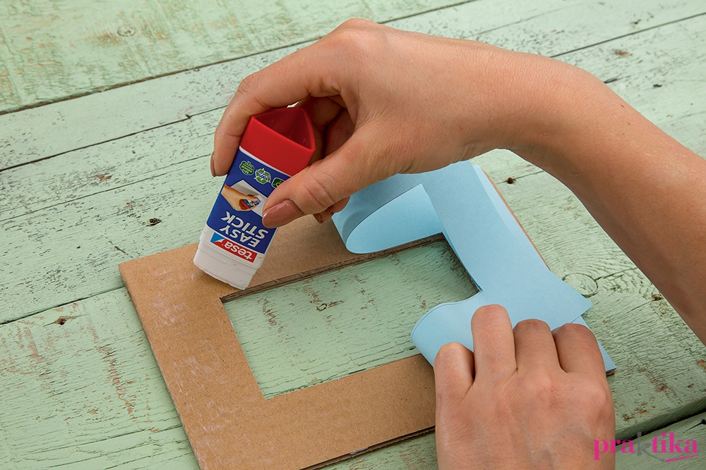 Vonalzó mentén vágj ki azonos méretű téglalapokat a hullámkartonból és a színes lapokból. Jelöld a képkivágásokat, és vágd ki azokat is mindegyiken. Ragasztózd be a keret felületét, és borítsd be színes papírral.