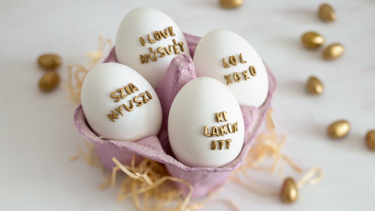 Hozzávalók • fehér héjú tojások • betűtészta • aranyszínű spray • gumigyurma • ragasztó •