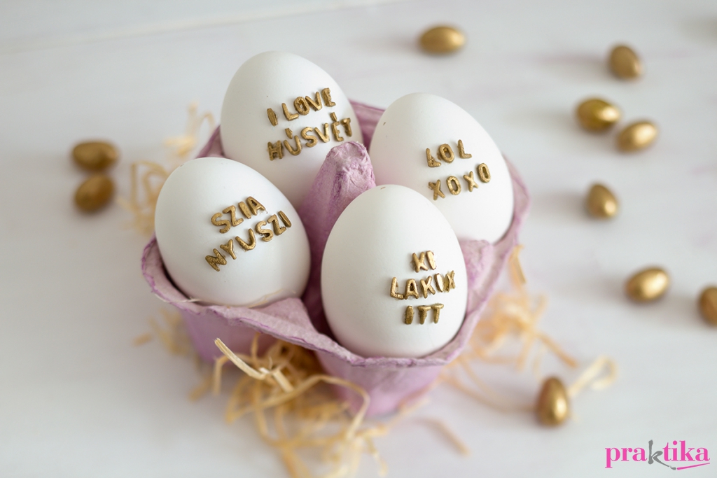 Válogasd ki az üzeneteket a betűkből, és óvatosan nyomd őket egy gumigyurma csíkba, hogy ne mozoghassanak. Fújd le a festékkel, majd ha megszáradt, ragaszd a feliratokat a kiválasztott tojásra.
