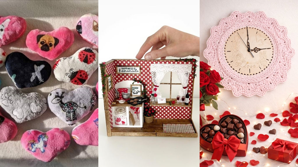 „Szívből jövő kedvességeket varrtam gyapjúfilcből, majd hímzőkeretbe foglaltam őket. Szatén masnival és rózsával díszítettem, végül organza tasakokba tettem.”