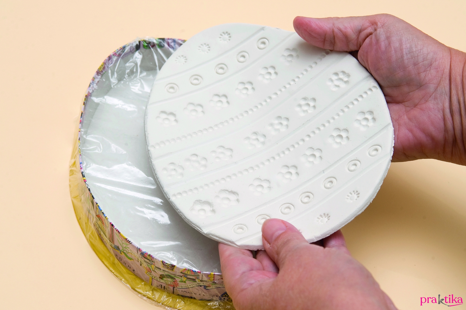 - A sablonívről másold ki indigó segítségével papírra a tojásmintát, és vágd ki pontosan a körvonalon. Nyújtsd ki a gyurmát 4-5 mm vastagra, fektesd rá a tojásmintát, és késsel karcold körbe.