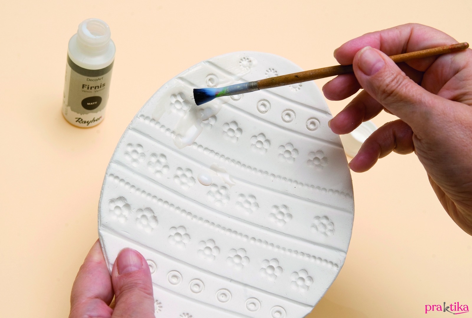 - Fektesd a tojást egy folpakkal kibélelt tálkába, (esetleg tojás alakú dobozba), hogy felvegye a kívánt formát, és hagyd szárad ni 1-2 napig. Ha kiszáradt, kend le lakkal, majd fesd le a kiálló, domború részeket, szivaccsal simogatva. Így a lakkrétegen porcelánszerűen jelenik meg a festék.