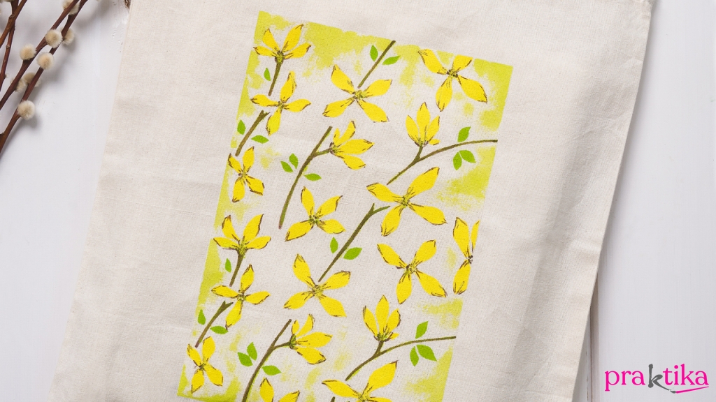 A napsárga aranyvesszőket sablonnal mintázhatod a vászontáskára. Utána a szirmoknak textilfilccel adhatsz egyedi karaktert. Ráadásként mi egy belső zsebet is varrtunk hozzá, amiben éppen elfér az összehajtott táska.