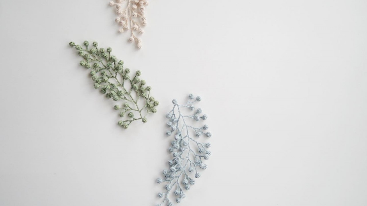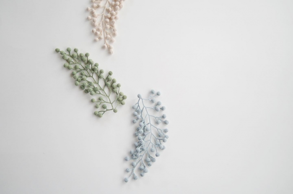 Leveleket, bogyókat és gombafajokat horgol meg és alakítja leheletfinom ékszerekké. A munkák mind természetes anyagokkal festett pamutból készülnek, színeik a késő őszi hangulatot idézik meg.