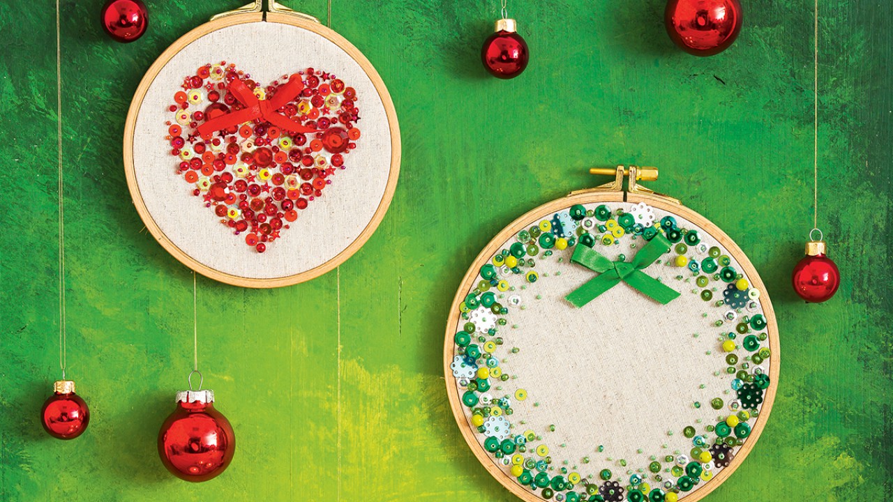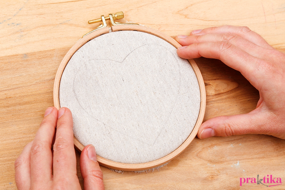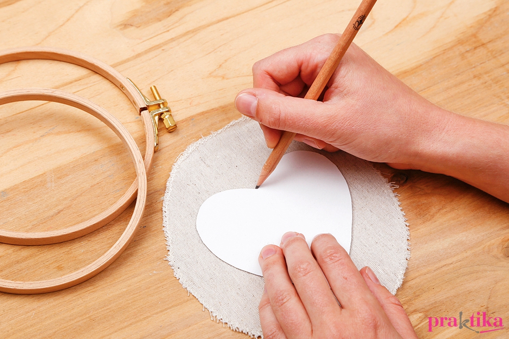 Szíves mintával is elkészítheted a képet. Rajzold fel a textilre halványan ceruzával, majd feszítsd a hímzőrámába. A vonalon belül varrd ki flitterekkel és gyöngyökkel. A szív felső részére varrj masnit.