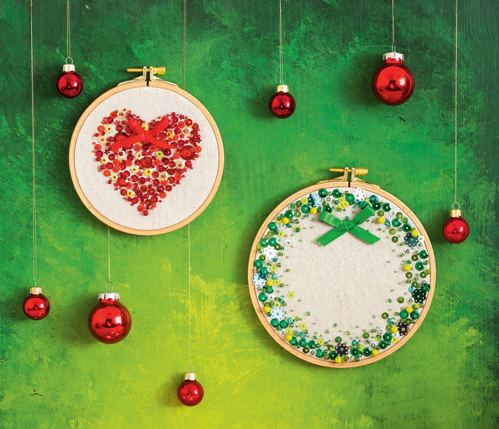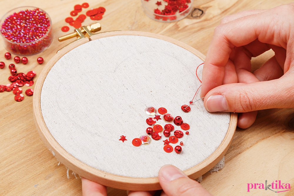 Vágj a hímzőrámánál 5 cm-rel nagyobb korongot a vászonból és cikcakkold végig a szélét. Feszítsd a hímzőrámába a vásznat. Kívülről befelé haladva varrj rá gyöngyöket és flittereket. Úgy alakítsd, hogy a szélén sűrűbben öltögess, befelé haladva pedig egyre kevesebb flitter és gyöngy kerüljön. Készíts a szalagból masnit és varrd a textil felső részére.