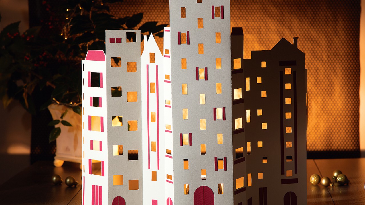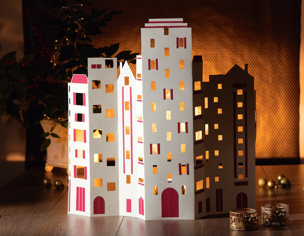 A paravánszerű házsor a hajtogatástól megáll magától, külön támaszték nélkül is. Tegyél mögé karácsonyi égősort, így az ablakokon keresztül kiszűrődő fény a téli esték hangulatát árasztja majd.